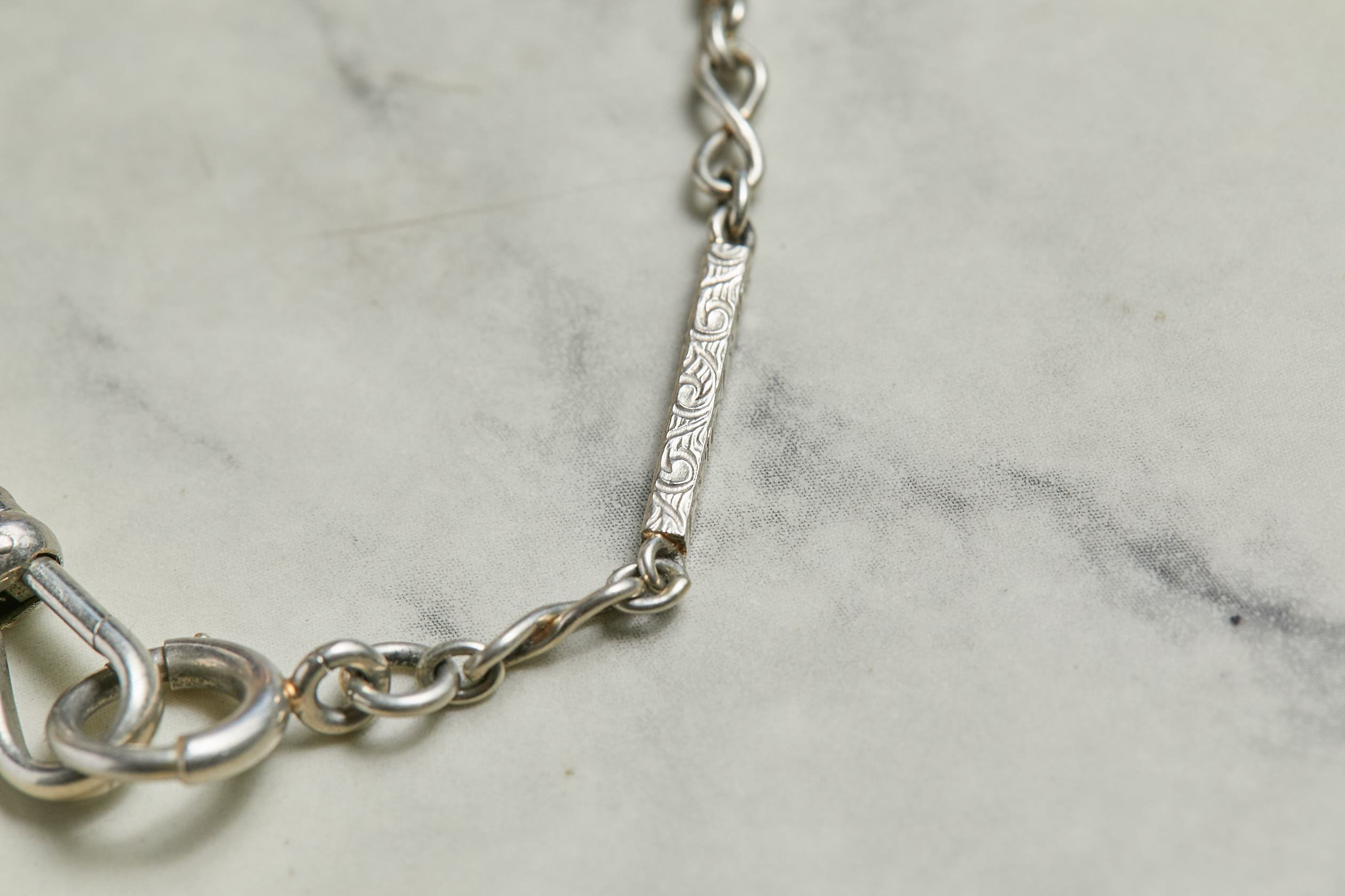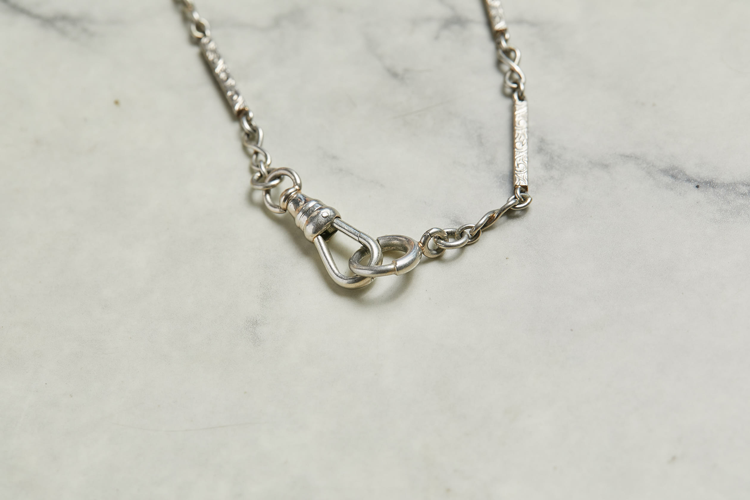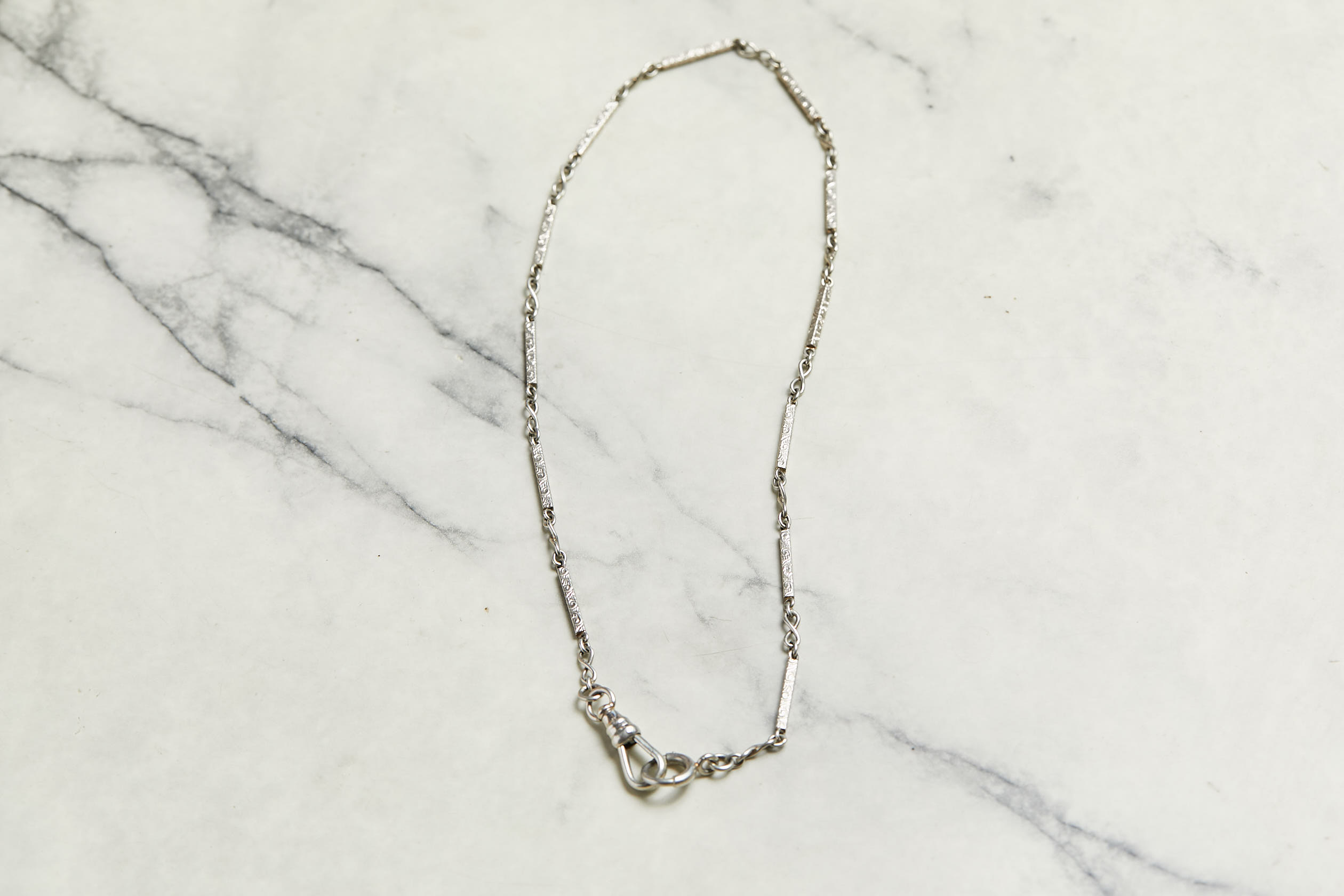 Las cadenas de reloj de hombre de la era victoriana fueron conocidas en la época como Albert Chain, porque el príncipe consorte Albert, marido de la Reina Victoria, impuso la moda de llevar así los relojes de bolsillo de los caballeros. Hoy, en Europa y Estados Unidos, esta tendencia es furor entre las fanáticas de las joyas antiguas. Ideal si se ponen varias, al estilo #neckmess, con chiches y dijes colgando de sus broches. Esta preciosura circa 1860-1890, es de oro blanco de 14 quilates, con bellos eslabones en forma de infinito y barras talladas. Pesa 8,7 gramos y mide 34 centímetros. Ideal como choker. Una belleza!