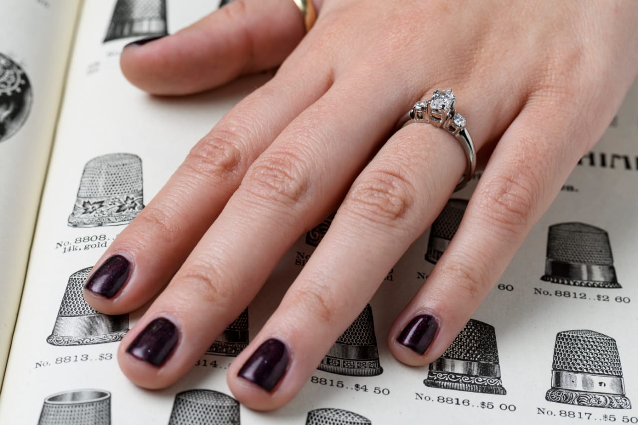El anillo es de oro blanco de 18 kilates, con un diamante marquise central de 60 puntos (color G, claridad SI), más dos brillantes de 10 puntos a cada lado, 80 puntos de diamantes en total. Tiene su certificado. Es talla 13 y pesa 2,8 gramos.