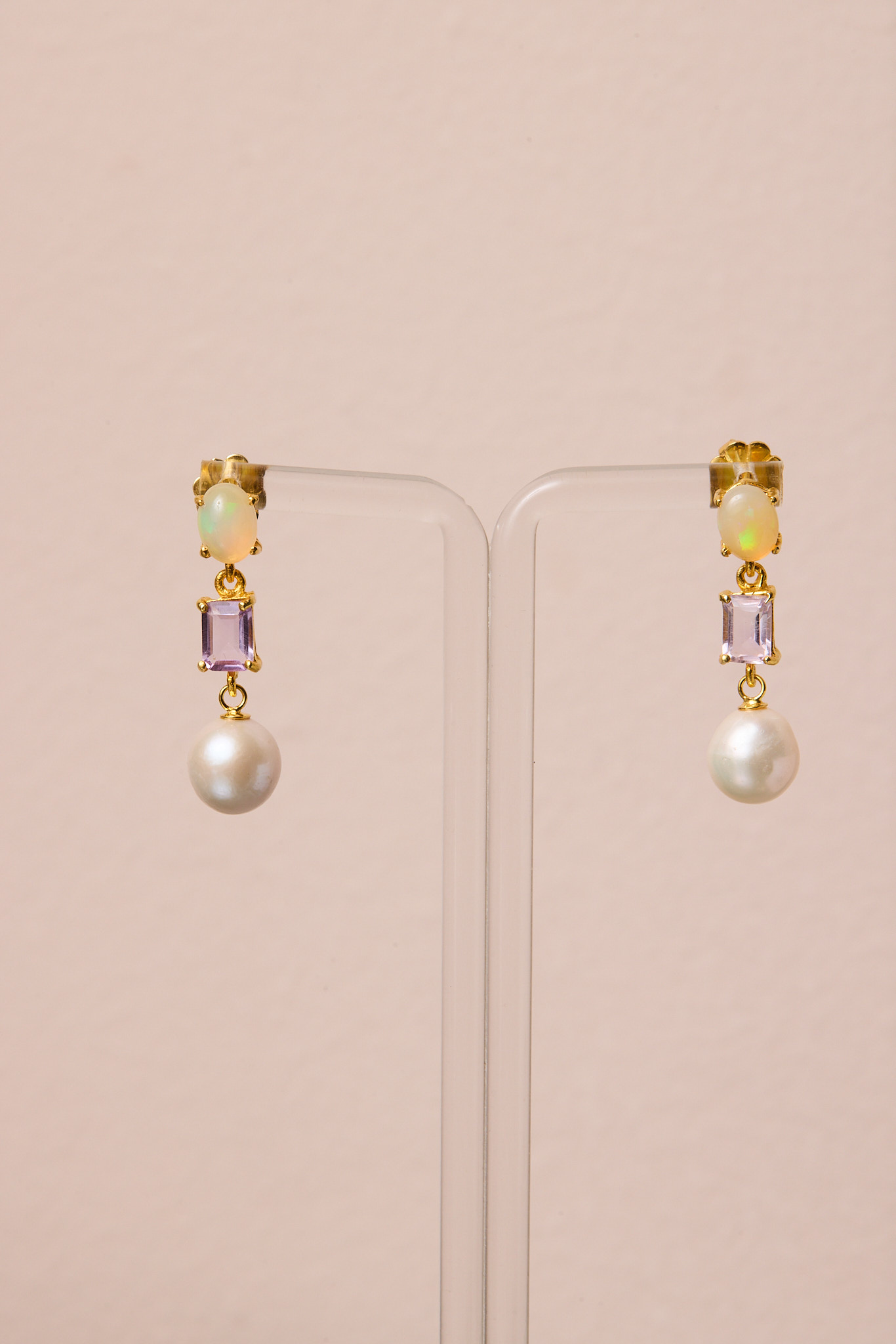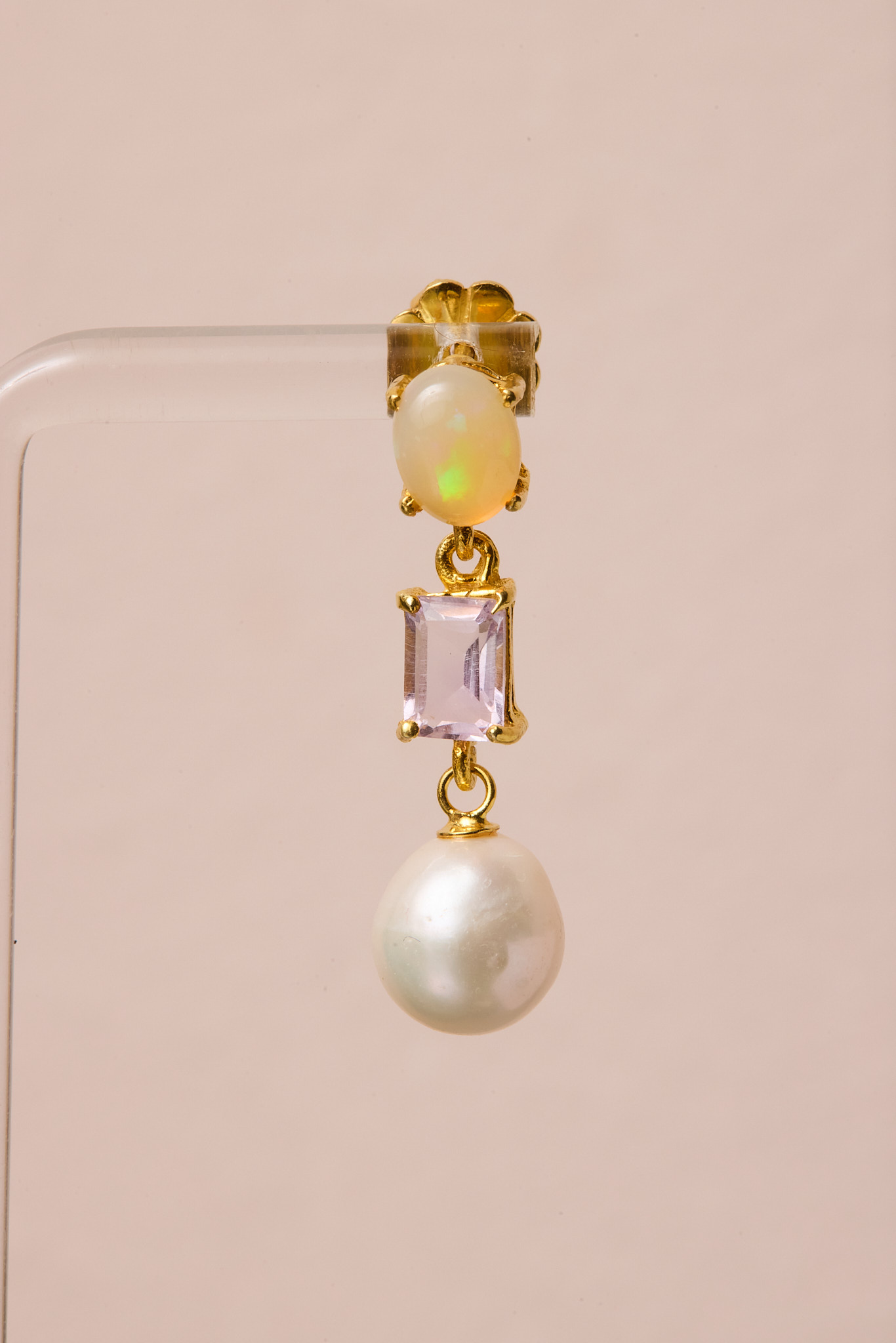 Hechos a mano en plata con baño de oro, ópalos, amatistas y perlas naturales.